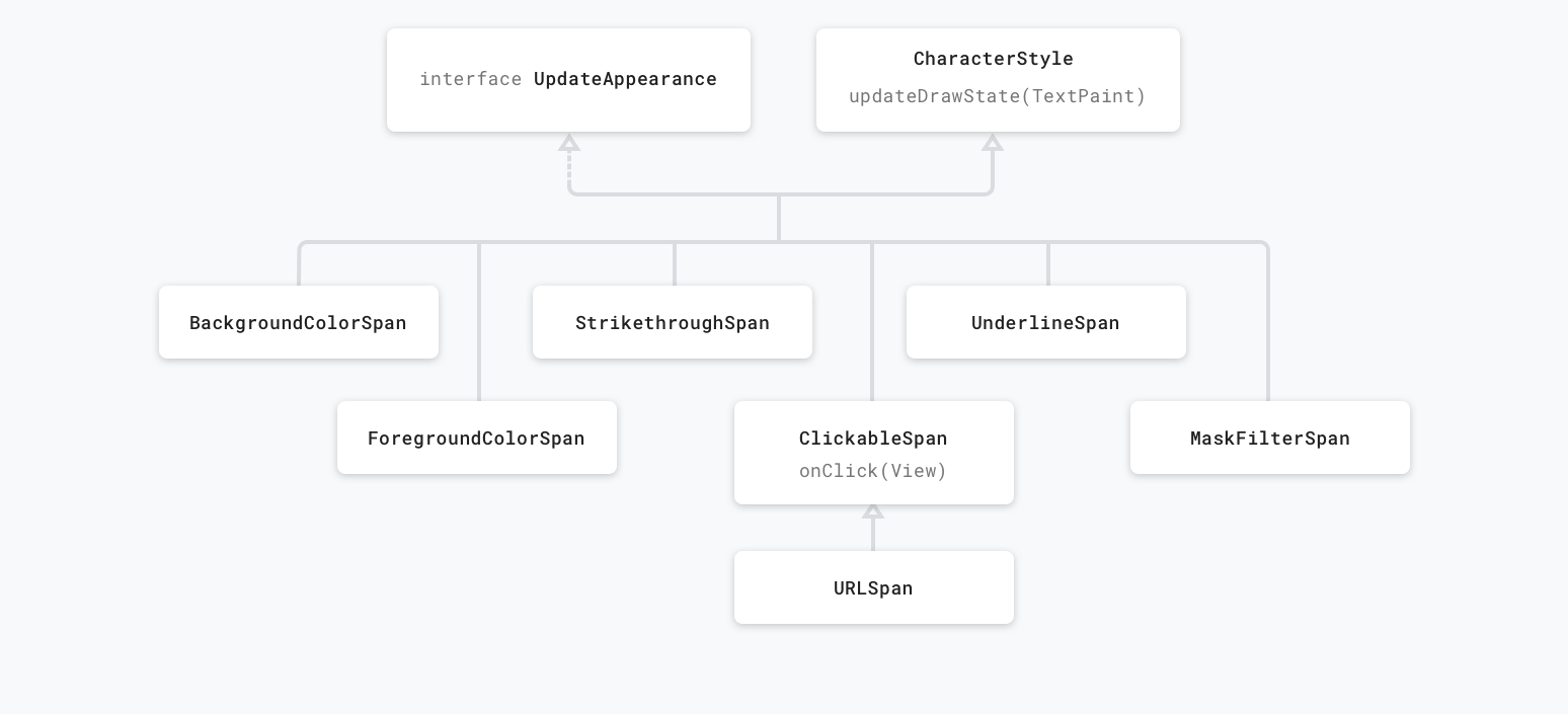 AndroidRuntimeRegisterandroidtextstyleCharacterStyle ApiSince1 DoNotGenerateAcwtrue public abstract class CharacterStyle. SpannableString class to implement text with foreground color background color underline strikethrough bold italic style relative font size superscript subscript URLs clickable text composed with image and so on. Für weitere Informationen siehe Link.
